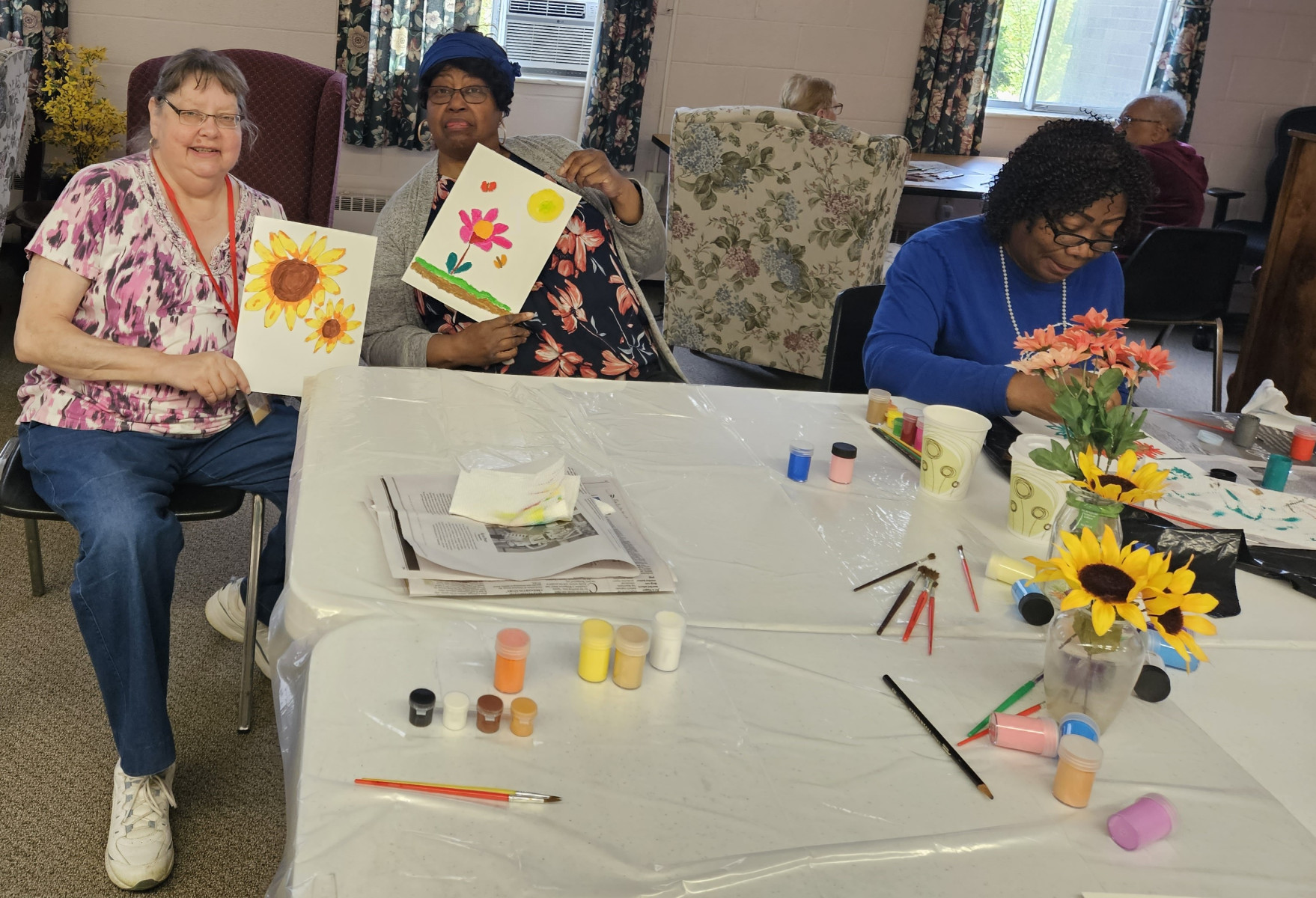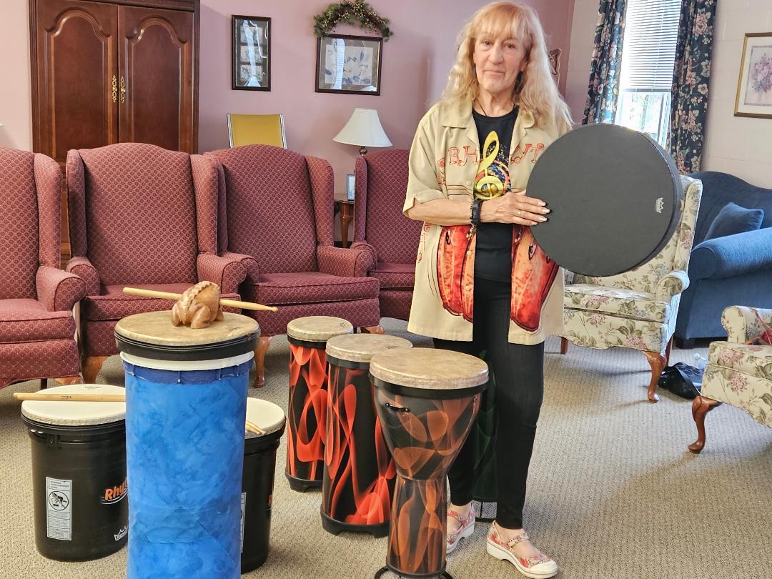 A delicious lunch was served in the dining room followed by a painting or coloring opportunity back in the conference room. At 2 pm Sat., a drum circle was presented by Carolyn Zimmerman. We each chose a drum and Carolyn Z. led us in the creation of a communal expression of music and rhythms. It was both a wonderful and spiritual experience.