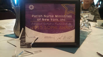 Congratulations to all the Faith Community Nurses of Parish Nurse Ministries of New York, Inc.! We have a SOPHI! Several members, Athena Tucker-Bowker, Amos Acree, Cindy Phillips, Mary Catherine Kennedy, and I attended the P2 first annual Spotlight on Population Health Awards. We were nominated within the Niagara Co. category. We did let them know that we are active in all counties of WNY today and during our process of submission. Thank you to Athena for writing a letter to P2 after our nomination, attached. For those of you that don’t know much about p2, I’ve attached some information. We also submitted fun facts, our mission statement, pictures, map of our areas with zip codes. I’ll try to have these available at the conference.